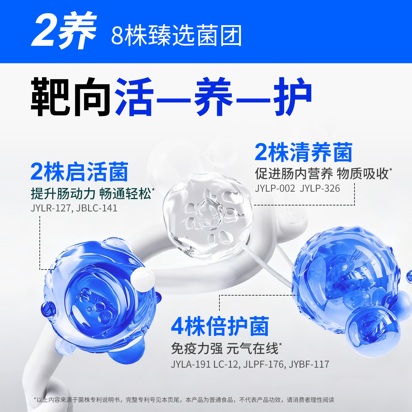 【配料表】复合乳酸菌粉 (动物双歧杆菌乳亚种JYBR-390(添加量100mg/瓶)、鼠李糖乳酪杆菌JYLR-127(添加量100mg/瓶)、干酪乳酪杆菌L.Casei21(添加量100mg/瓶)、罗伊氏粘液乳杆菌JYLB-291(添加量100mg/瓶)嗜酸乳杆菌JLA-191(添加量20mg/瓶)、植物乳植杆菌JLP-326(添加量20mg/瓶)、长双歧杆菌长亚种JBLC-141(添加量20mg/瓶)、短双歧杆菌JBF-117(添加量20mg/瓶)、副干酪乳酪杆菌JLPF-176(添加量10mg/瓶)、植物乳植杆菌JLP-002(添加量10mg/瓶))(出厂添加活菌数>500亿CFU/瓶)、益生元(低聚果糖、低聚木糖、低聚半乳糖、水苏糖)、赤藓糖醇、麦芽糊精、二氧化硅
