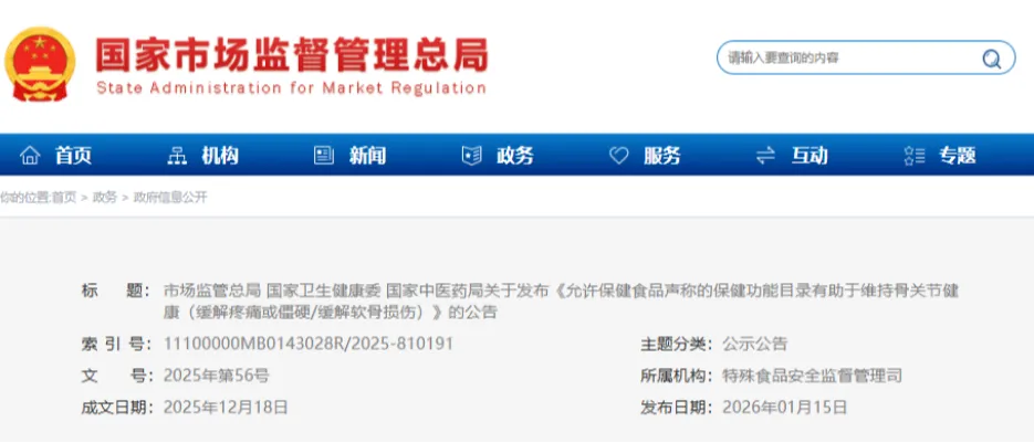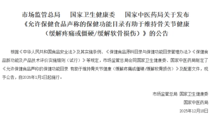 2026年1月16日,市场监管总局联合国家卫生健康委、国家中医药管理局正式发布《允许保健食品声称的保健功能目录 有助于维持骨关节健康(缓解疼痛或僵硬/缓解软骨损伤)》。这是自保健食品新功能评价细则实施以来,首个纳入目录的新功能,标志着我国骨关节健康类保健食品正式告别“功能标注模糊”的时代,迈入合规化、精准化发展新阶段。