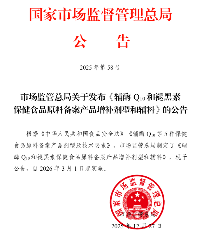 2025年12月31日,市场监管总局发布《辅酶Q10和褪黑素保健食品原料备案产品增补剂型和辅料》的公告(以下简称公告),在2021年发布的备案产品剂型及技术要求基础上,进一步增补辅酶Q10和褪黑素备案产品剂型和可用辅料。